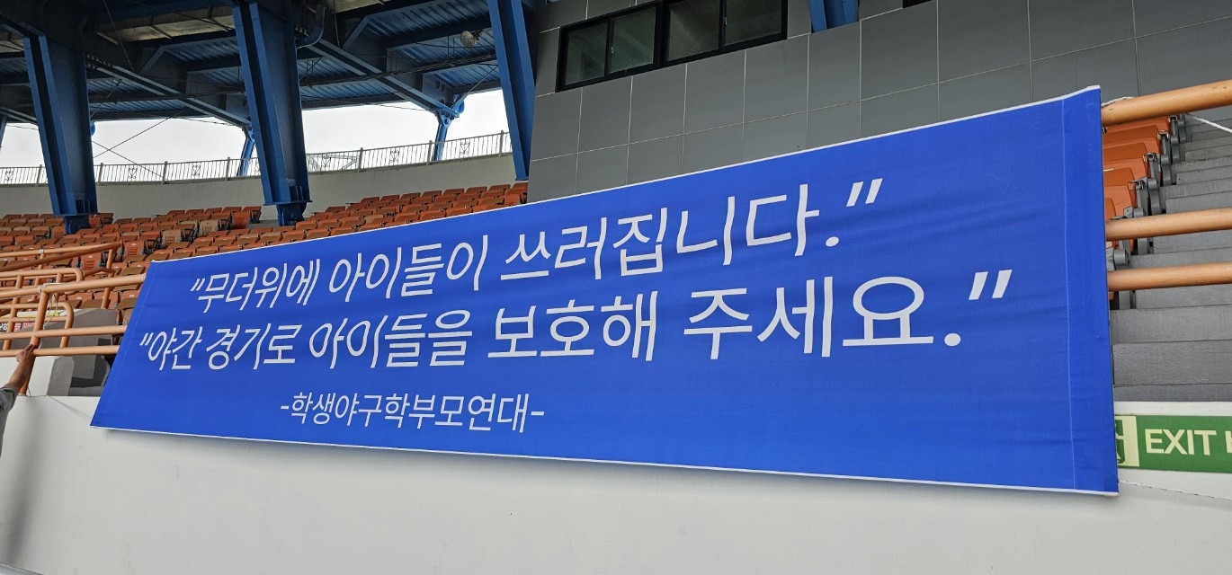 학부모연대에서 목동야구장에 거치한 현수막입니다. 야간경기 진행에 대한 질의에 왜 답이 없을까요? 협회에서는 정확한 입장을 말씀해주세요. 무엇보다 선수들의 안전에 관한 질의 아닙니까.