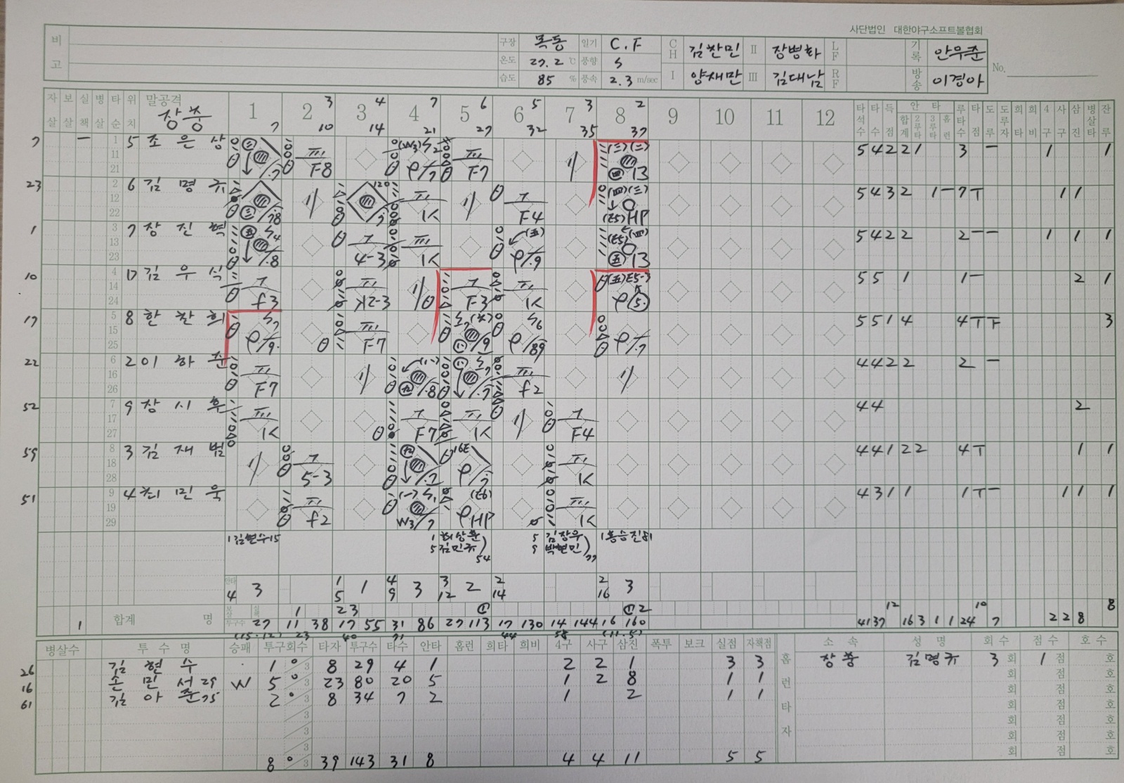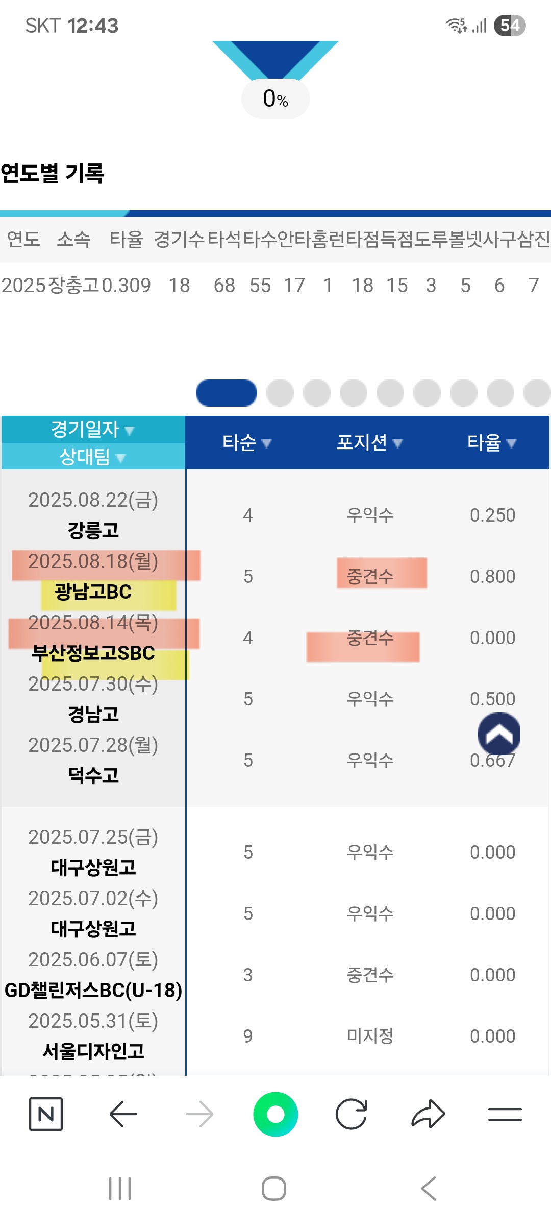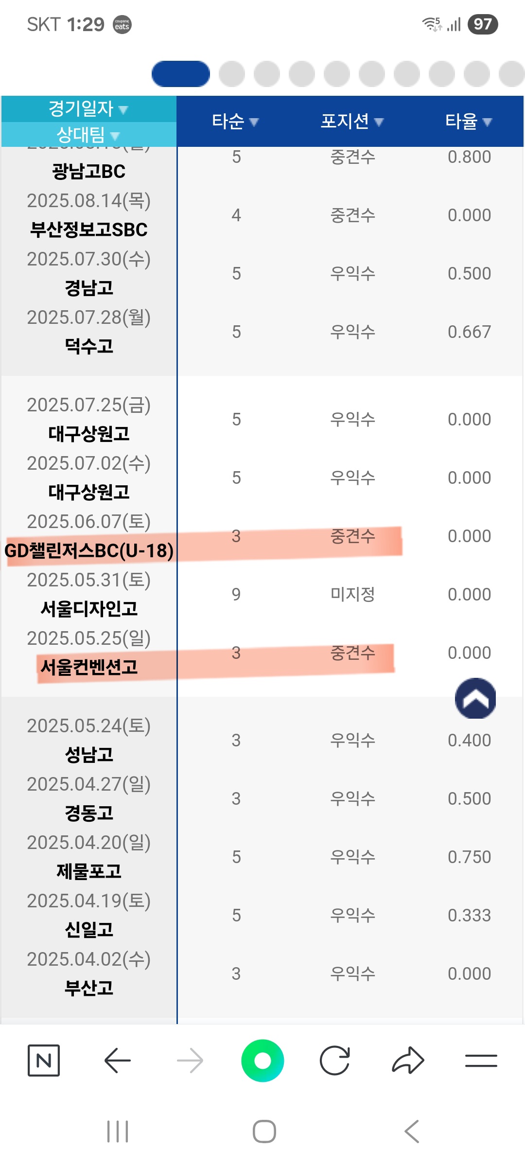 중견수 수비이닝 기록이 13이닝(주말리그후반기) 만 표기되어 있고, 봉황대기 중견수 16이닝이 기록이 안되어있어 문의드립니다. 장충고등학교 한찬희입니다.