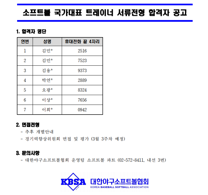 소프트볼 국가대표 트레이너 서류전형 합격자 공고.png
