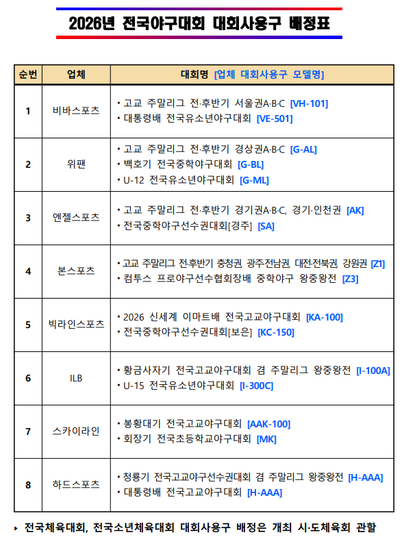 2026년 전국야구대회 대회사용구 배정