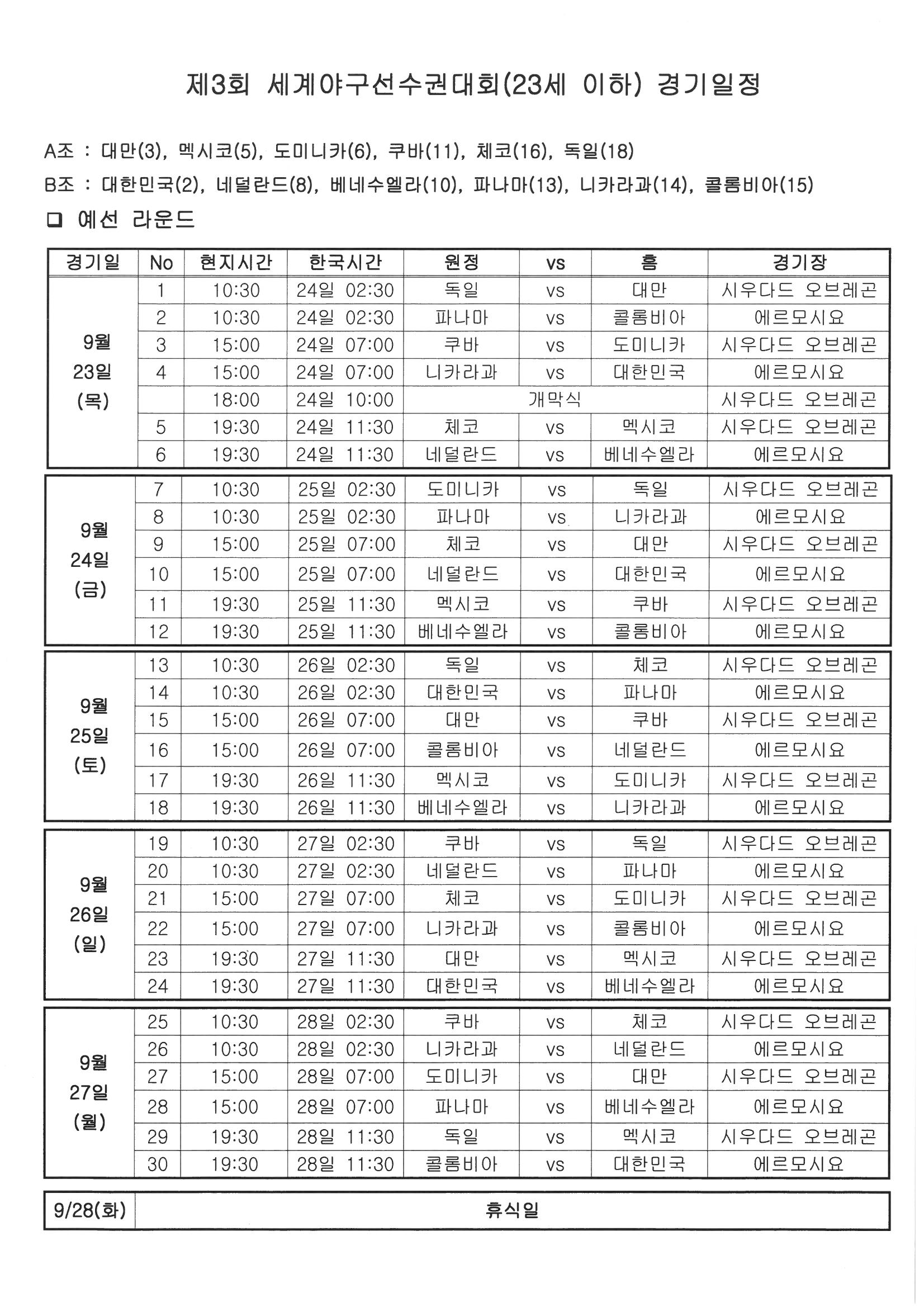 * 제3회 세계야구선수권대회(23세 이하) 경기는 SPOTV를 통해 생중계될 예정입니다. 많은 관심과 시청 바라며 우리 선수에게 힘이 될 수 있는 응원 부탁드리겠습니다