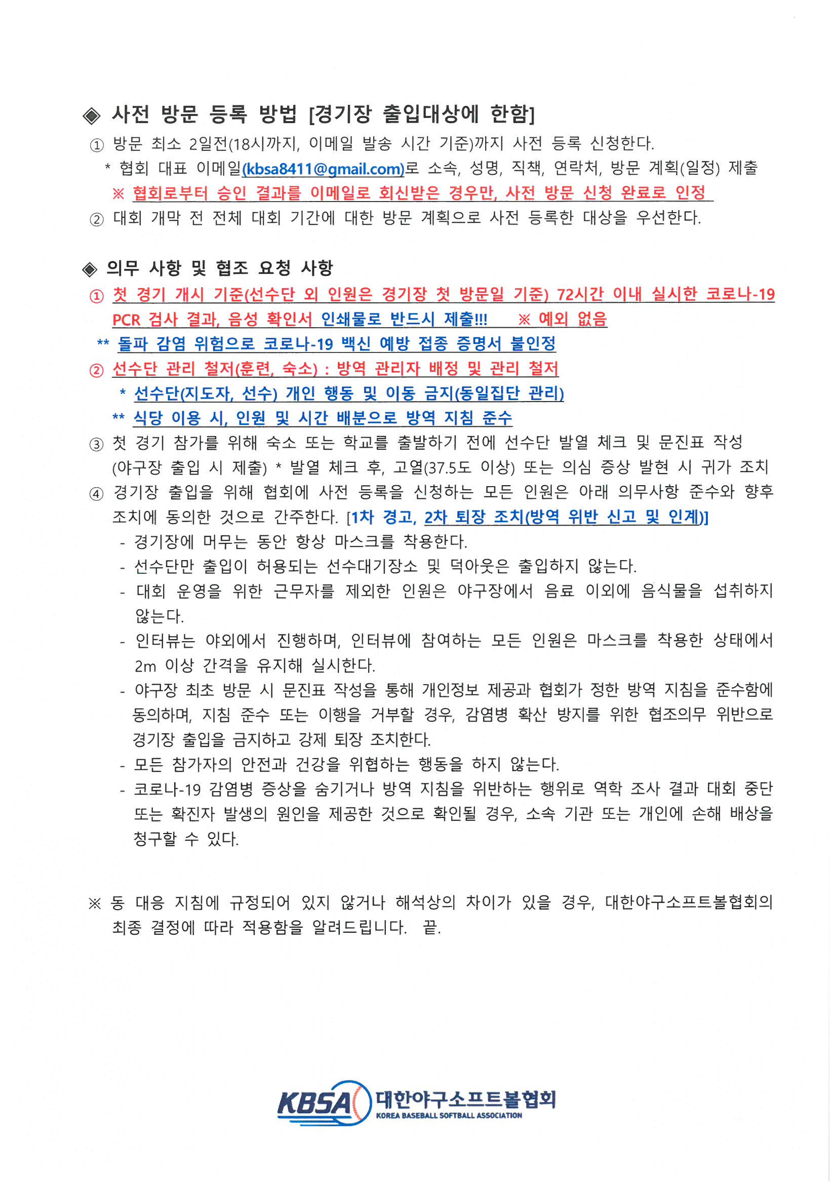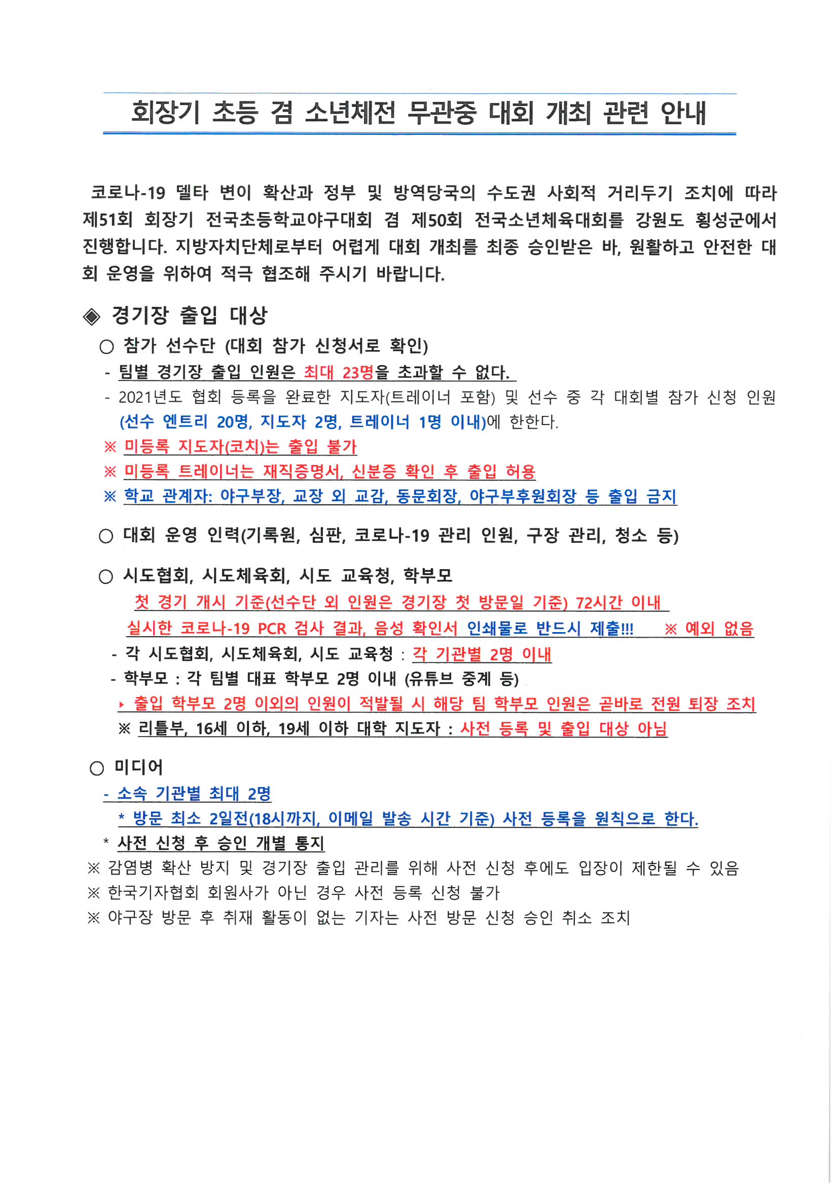 제51회 회장기 전국초등학교야구대회 겸 제50회 전국소년체육대회 무관중 대회 개최 관련 안내