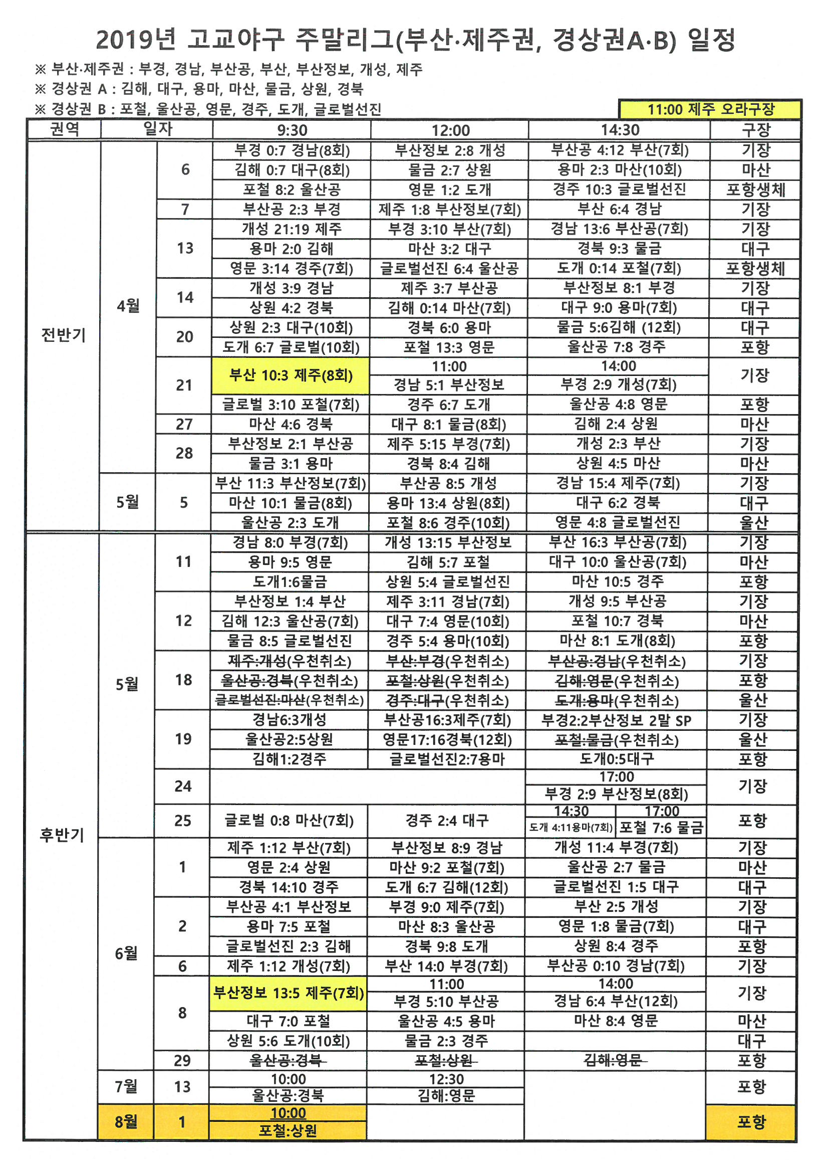 2019 고교야구 주말리그 경상권AB 잔여경기 편성안내