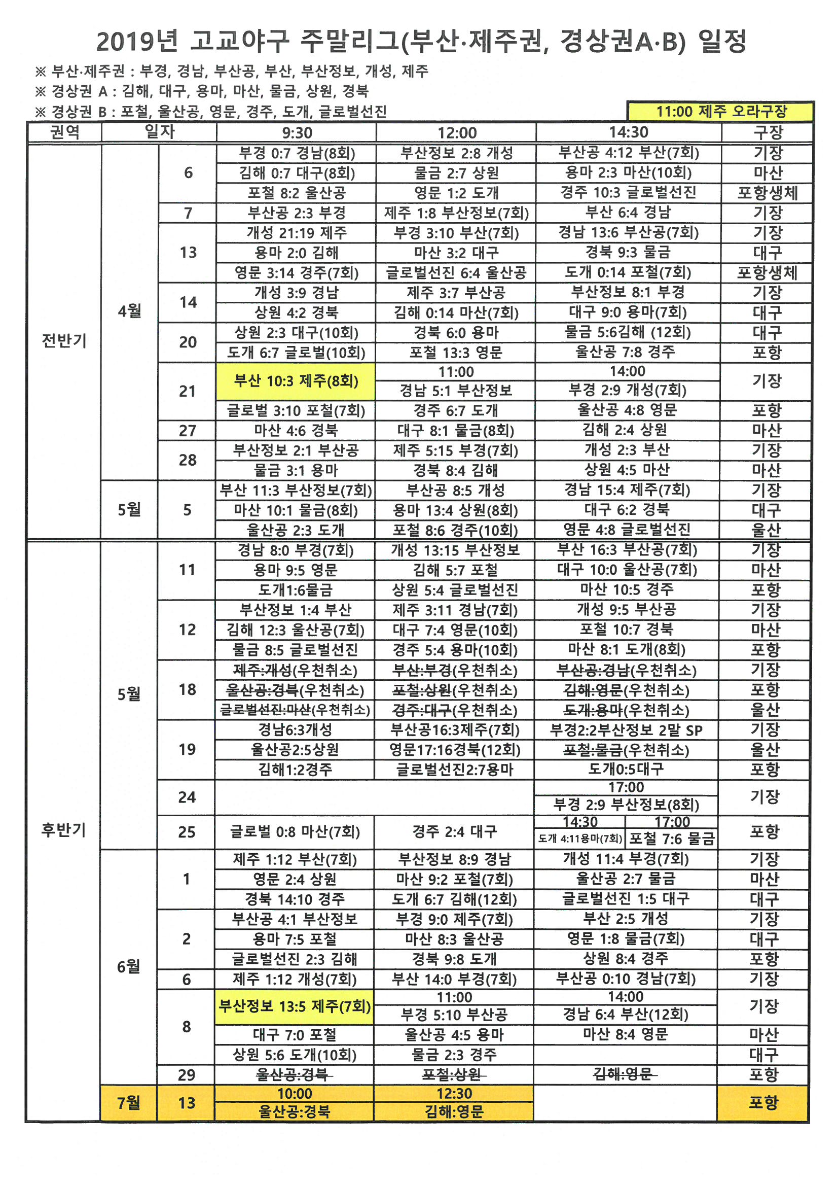 2019 고교야구 주말리그 후반기 잔여경기 재편성 안내