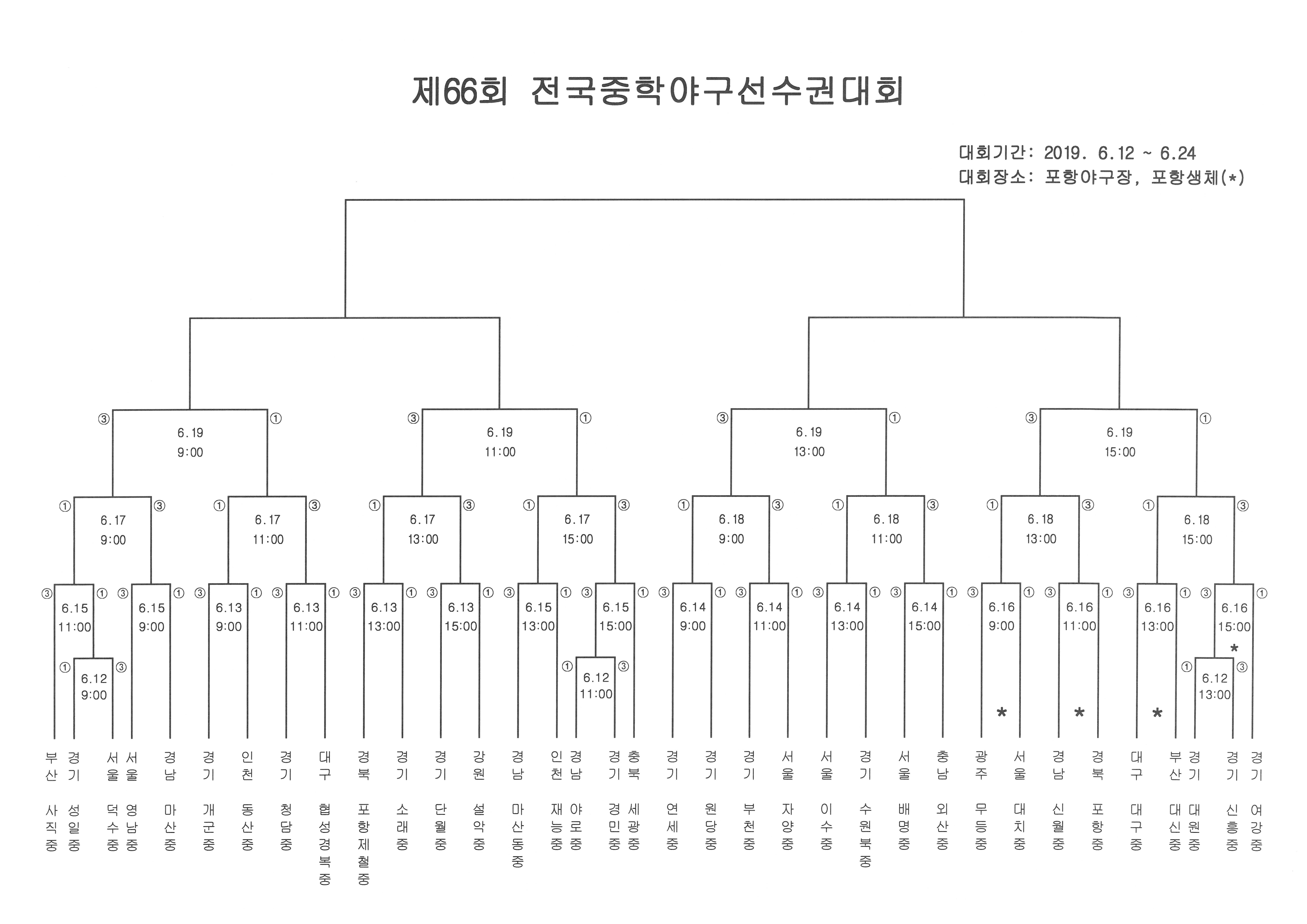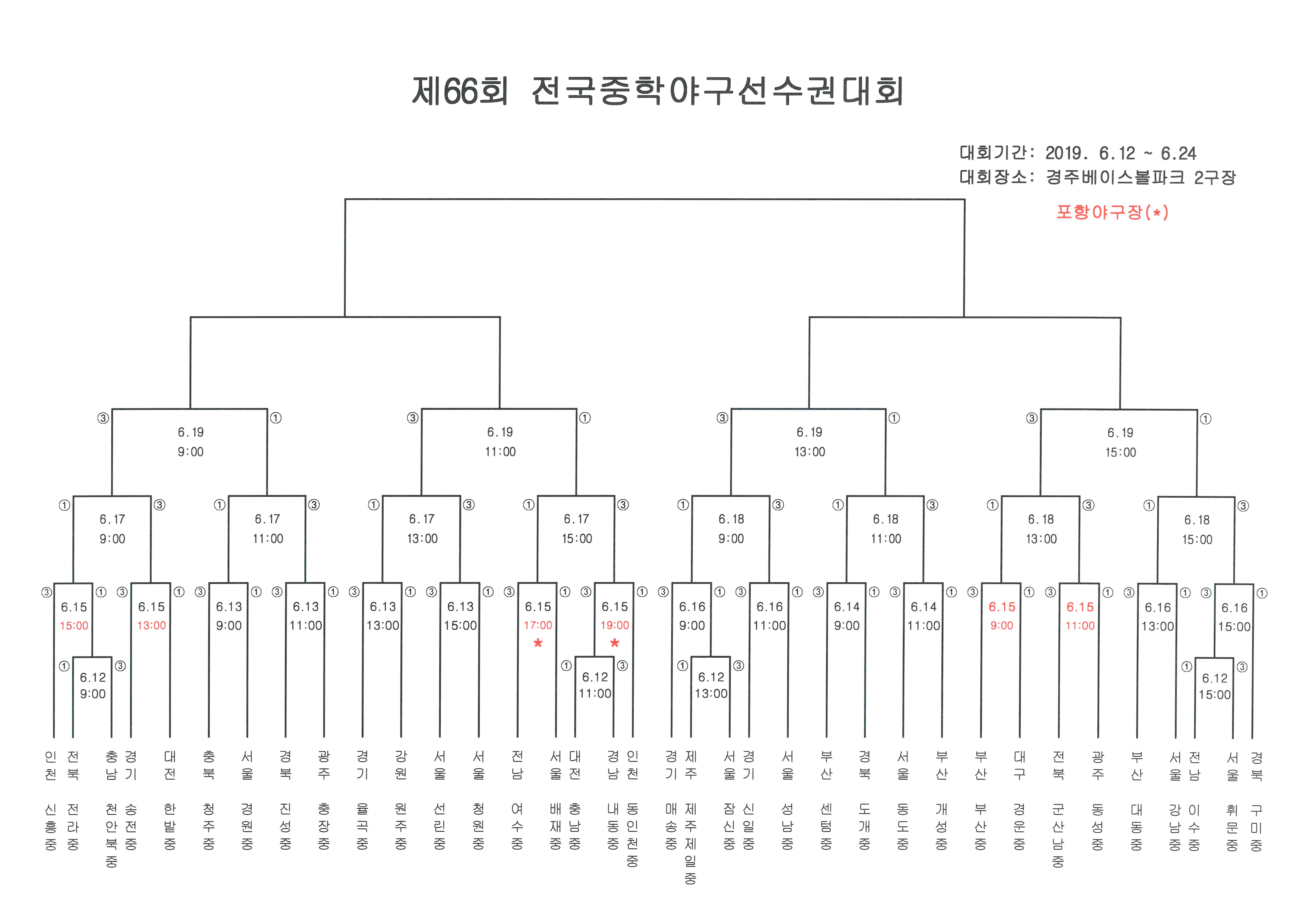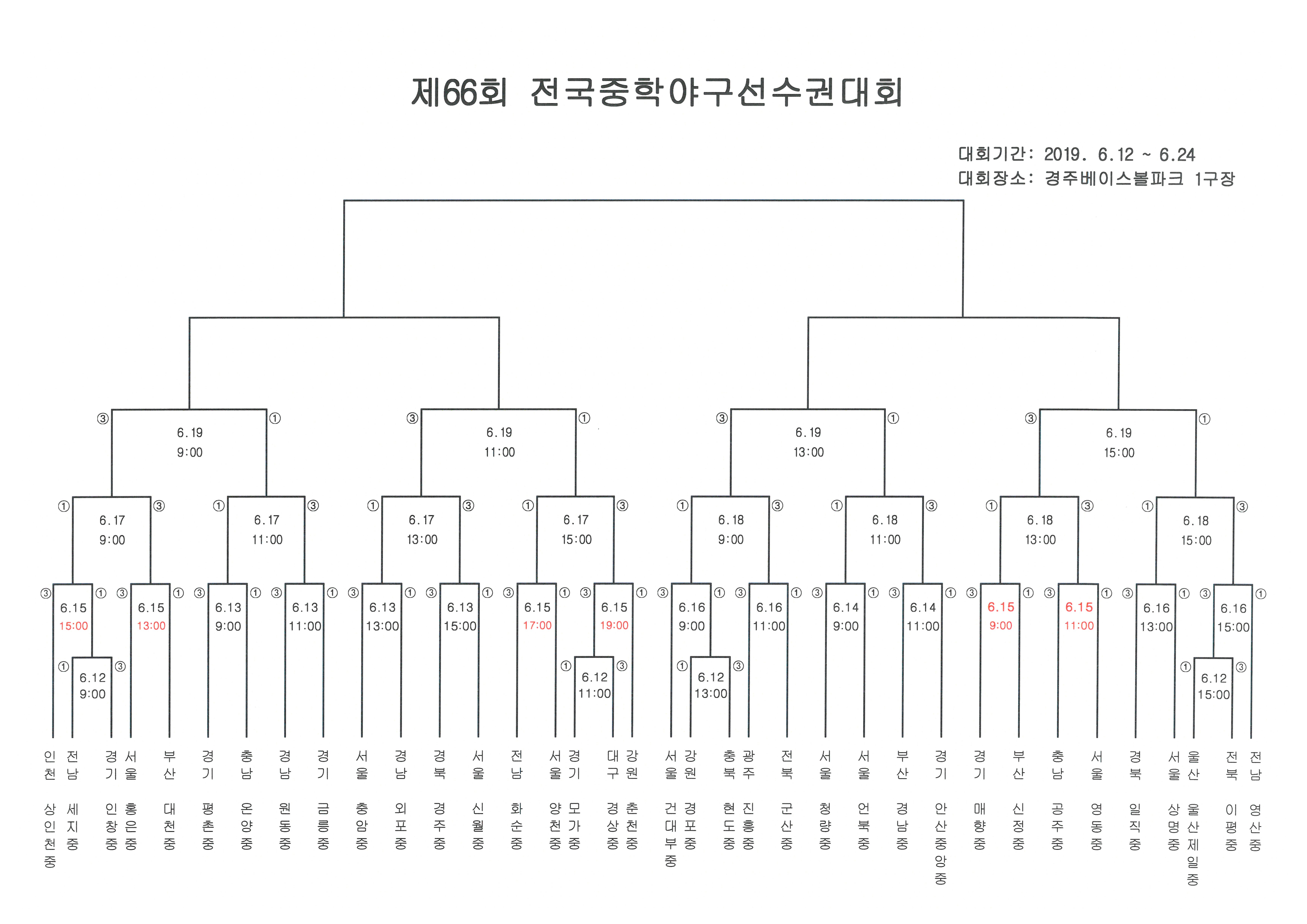 6월 14일 중학야구선수권대회 우천순연으로 6월 15일 경기일정 및 시간이 재조정되었습니다.