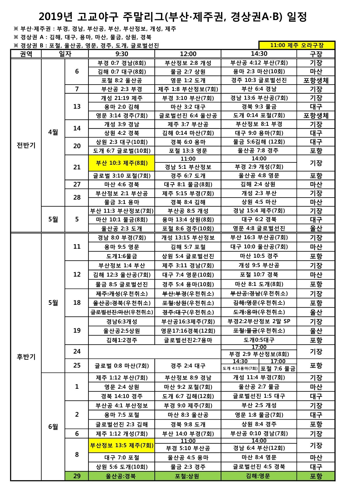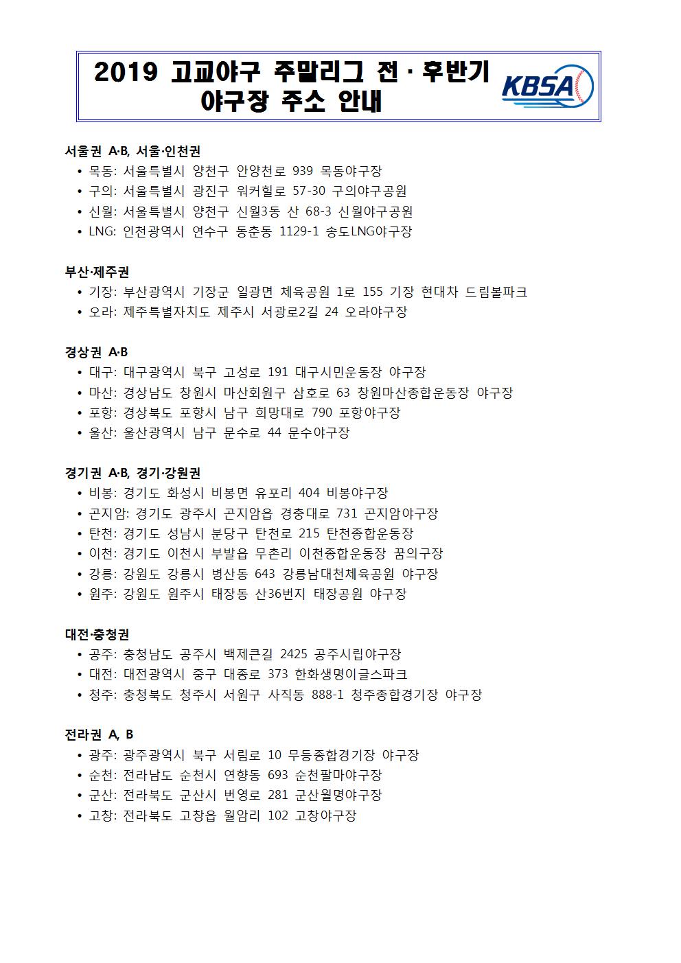 2019 고교야구 주말리그 (경상권A·B) 우천취소 재편성 안내