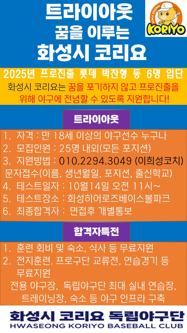 화성시 코리요는 꿈을 포기하지 않고 프로진출을 위해 야구에 전념할 수 있도록 지원합니다!