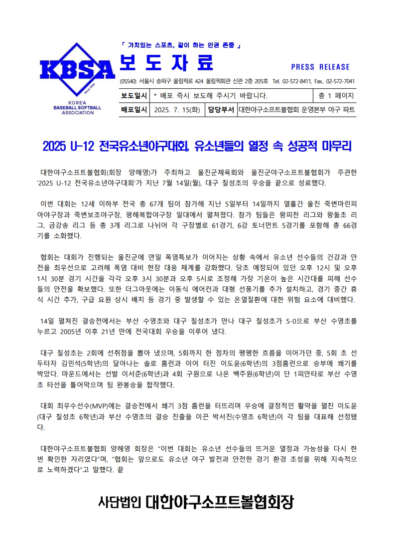 (보도자료) ‘2025 U-12 전국유소년야구대회’, 유소년들의 열정 속 성공적 마무리_1.jpg
