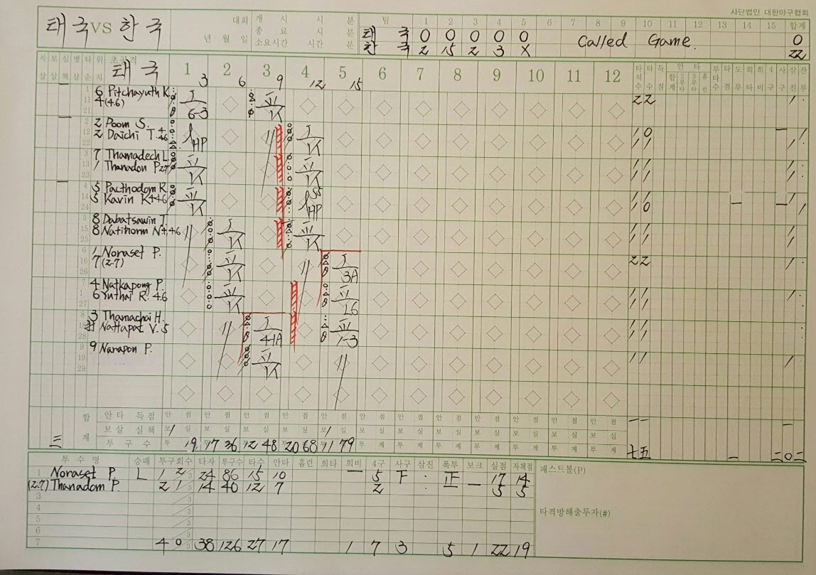 2회에는 밀어내기 볼넷으로 가뿐히 점수를 쌓기 시작했다. 이어 박정우와 김민수의 연속 적시타가 터졌다. 점수 차가 벌어지자 태국 투수 노라셋은 급격히 무너졌다. 야수들은 연이은 수비 실책을 범했다. 한국은 이 틈을 타 17-0까지 달아났다.